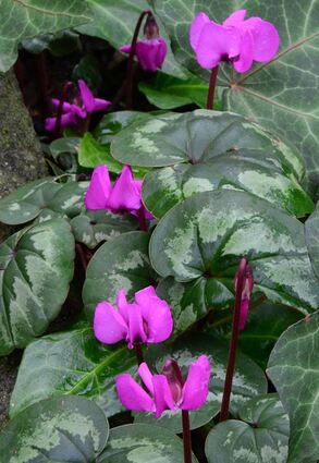 Meist kennt man Alpenveilchen nur als Zimmerpflanzen, aber dies winterharten Sorten, die gut mit unserem Klima zurechtkommen, kann man bedenkenlos in den Garten pflanzen. Sie trotzen in geschützten Lagen Minustemperaturen. Bereits im Februar erfreuen diese Alpenveilchen mit nicht duftenden Blüten und kreisrunden, dunkelgrünen Blättern. Nach der Blüte ziehen sich die Pflanzen ein und erscheinen im nächsten Jahr wieder. / koe