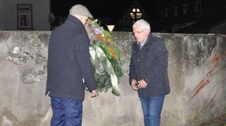Nach der Andacht gingen die Besucher in die Bangertsgasse, wo die frühere Synagoge steht. Dort legte Bürgermeister Heun mit dem Vorsitzenden der Gemeindevertretung, Helmut Adam, einen Kranz nieder.
