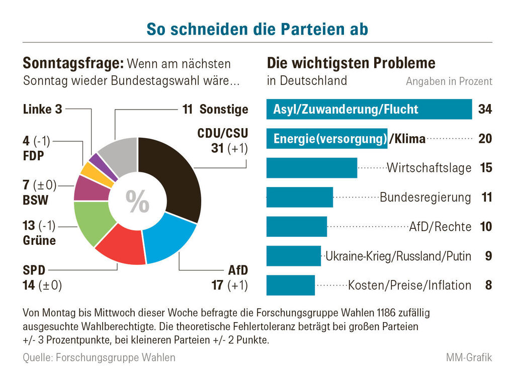 Eine Zusammenarbeit mit dem BSW dürfte der CDU nach seiner Ansicht leichter fallen, weil Wagenknechts Partei nicht so links wie die Linke und nicht so rechts wie die AfD ist. Auch die Befragten haben da keine Bauchschmerzen. 72 Prozent sehen in der AfD eine Gefahr für die Demokratie. Deshalb würde es die Mehrheit (53 Prozent) begrüßen, wenn die CDU nach den Landtagswahlen Gespräche mit dem BSW über Regierungsbildungen aufnehmen würde. Bei den Ostdeutschen sind es sogar 63 Prozent. In der Anhängerschaft der Union ist das Meinungsbild allerdings gespalten. 48 Prozent fänden Gespräche gut, 46 Prozent lehnen sie ab. Im BSW-Lager gibt es dagegen mit 95 Prozent so gut wie keinen Widerspruch.