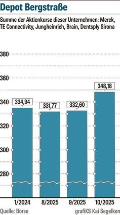 - Im Depot Bergstraße/Südhessen sind die Anteilsscheine des Dentaltechnikweltmarktführers Dentsply Sirona enthalten, ebenso die Papiere von TE Connectivity. Beide Konzerne sind an US-Börsen notiert. Für den besseren Vergleich werden Euro-Wechselkurse verwendet. Mit von der Partie sind die Anteilsscheine des Flurfördertechnikunternehmens Jungheinrich und des Zwingenberger Biotechunternehmens Brain. Nicht fehlen darf natürlich der Dax-Konzern Merck aus Darmstadt.