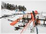 Der Blick ist auf eine verschneite Küstenlandschaft gerichtet. Davor bilden hölzerne Stege mit ihren linearen Strukturen ein optisches Sperrgatter. Der nüchternen Komposition sind rote, blaue und schwarze Farbelemente zugefügt. ...